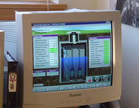 One advantage of PLCs that simply cannot be duplicated by electromechanical relays is remote monitoring and control via digital computer networks. Because a PLC is nothing more than a special-purpose digital computer, it has the ability to communicate with other computers rather easily. The following photograph shows a personal computer displaying a graphic image of a real liquid-level process (a pumping, or “lift,” station for a municipal wastewater treatment system) controlled by a PLC.