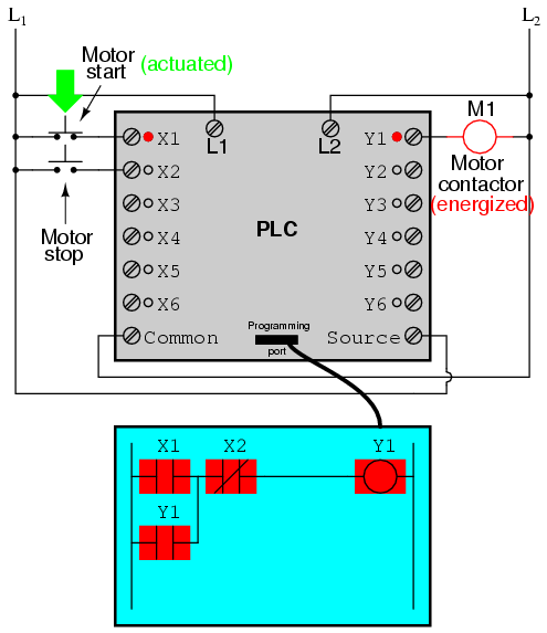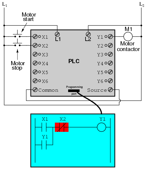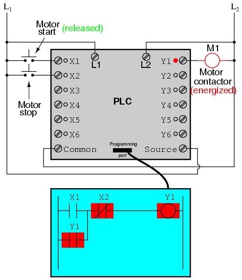 Furthermore, since each output in the PLC is nothing more than a bit in its memory as well, we can assign contacts in a PLC program “actuated” by an output (Y) status. Take for instance this next system, a motor start-stop control circuit: