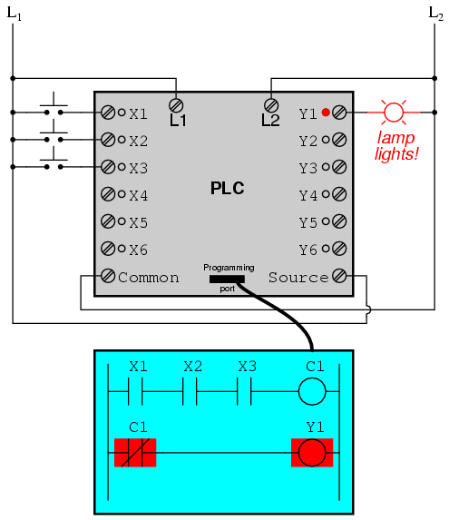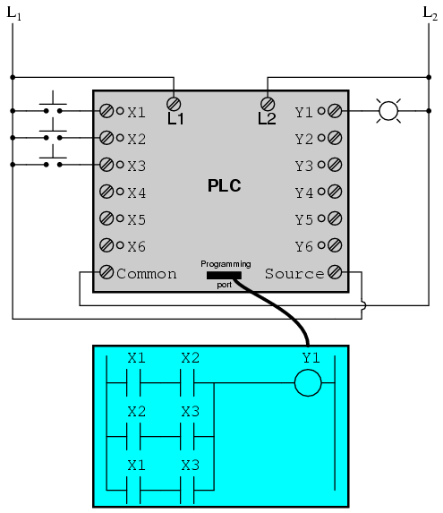 To build an equivalent circuit using electromechanical relays, three relays with two normally-open contacts each would have to be used, to provide two contacts per input switch. Using a PLC, however, we can program as many contacts as we wish for each “X” input without adding additional hardware, since each input and each output is nothing more than a single bit in the PLC’s digital memory (either 0 or 1), and can be recalled as many times as necessary.
