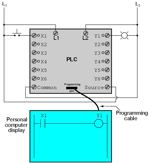 PLCs are industrial computers, and as such their input and output signals are typically 120 volts AC, just like the electromechanical control relays they were designed to replace. Although some PLCs have the ability to input and output low-level DC voltage signals of the magnitude used in logic gate circuits, this is the exception and not the rule. Signal connection and programming standards vary somewhat between different models of PLC, but they are similar enough to allow a “generic” introduction to PLC programming here.