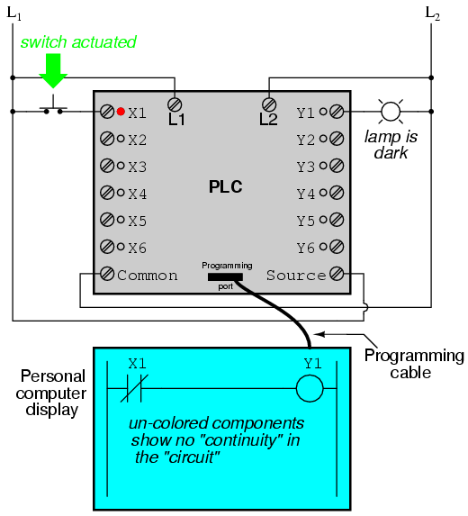 When the pushbutton switch is unactuated (unpressed), no power is sent to the X1 input of the PLC. Following the program, which shows a normally-open X1 contact in series with a Y1 coil, no “power” will be sent to the Y1 coil. Thus, the PLC’s Y1 output remains de-energized, and the indicator lamp connected to it remains dark.