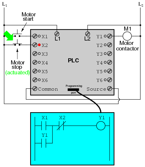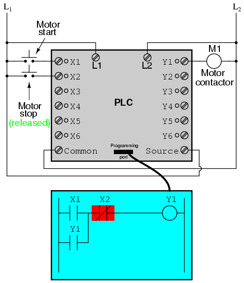When the normally-closed “Stop” pushbutton switch is unactuated (not pressed), the PLC’s X2 input will be energized, thus “closing” the X2 “contact” inside the program. This allows the motor to be started when input X1 is energized, and allows it to continue to run when the “Start” pushbutton is no longer pressed. When the “Stop” pushbutton is actuated, input X2 will de-energize, thus “opening” the X2 “contact” inside the PLC program and shutting off the motor.