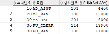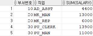 위의 예를 보면 20번 부서가 2번 나와 있는데 이는 같은 부서일지라도 직업이 다르기 때문에 다른 그룹으로 묶인 것이다.