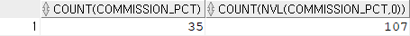 그룹함수는 null 값을 무시하기 때문에 첫 번째의 경우는 보너스를 받는 사람의 수만 계산된 것이고,