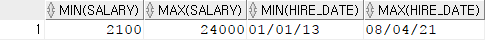 select min(salary), max(salary), min(hire_date), max(hire_date)