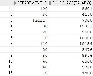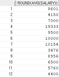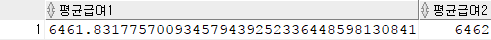 select avg(salary) 평균급여1, round(avg(salary)) 평균급여2