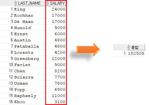 | SUM | 총 합계를 계산한다. | SUM(컬럼) |