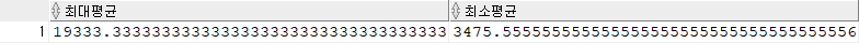 select max(avg(salary)) 최대평균, min(avg(salary)) 최소평균