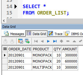 -> INSERT INTO ORDER_LIST VALUES('20120901','MULTIPACK',10,300000);