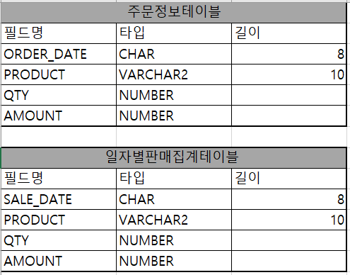 테이블은 다음과 같습니다. 주문정보테이블에 실시간으로 데이터가 입력될 때마다 트리거가 발동되어 자동으로 일자별판매집계테이블에 일자별, 상품별 판매수량과 판매금액을 계산해 업데이트 하는 작업을 하도록 하고, 사용자들은 미리 계산된 일자별판매집계테이블을 조회하게 하여 실시간 조회를 지원하게 하는 것입니다.