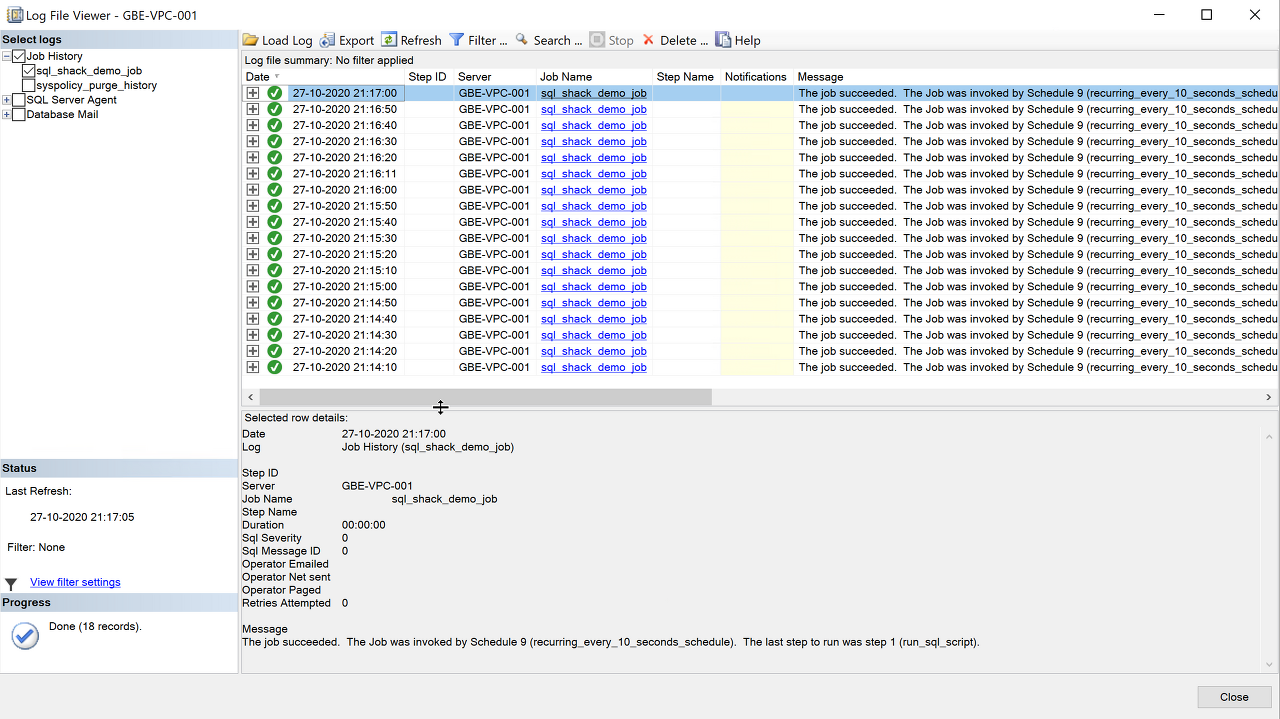 Alternatively, you can also view the execution history of the job by right-click and selecting View History from the context menu.