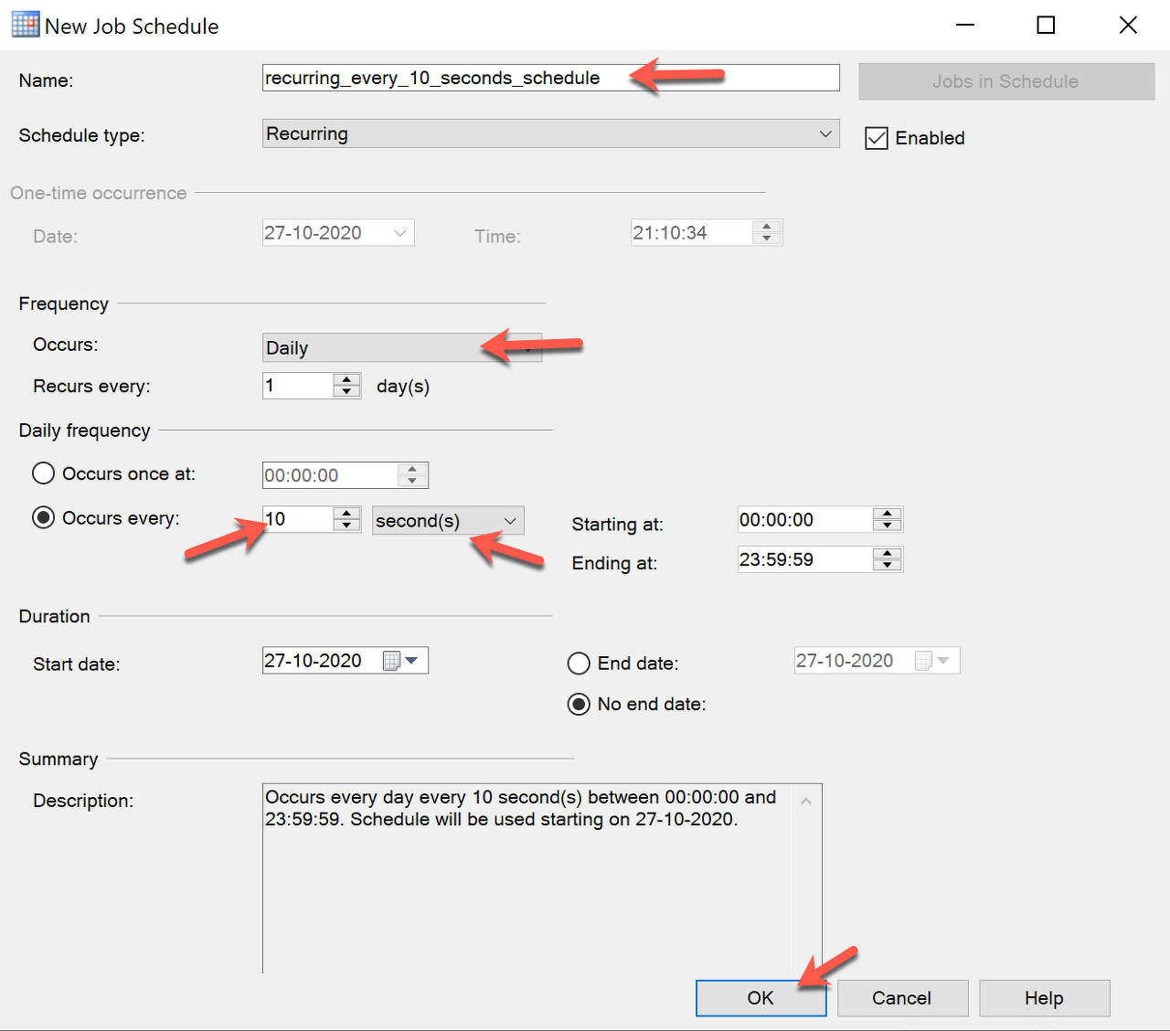 On the New Job Schedule window, provide a name for the schedule. Most often, we keep a descriptive name so that it is easier to understand the nature of the schedule. Select the Schedule Type as Recurring since we are going to execute the job repeatedly. Select the Frequency as Daily and Daily Frequency as every 10 seconds. In real applications, it is usually scheduled every hour or every day depending on the requirements. Click OK once done.