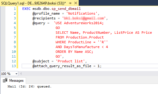 EXEC msdb.dbo.sp_send_dbmail @profile_name = 'Notifications', @recipients = 'Use a valid e-mail address, @query = 'USE AdventureWorks2014; GO SELECT Name, ProductNumber, ListPrice AS Price FROM Production.Product WHERE ProductLine = ''R'' AND DaysToManufacture < 4 ORDER BY Name ASC; GO', @subject = 'Product list', @attach_query_result_as_file = 1; |