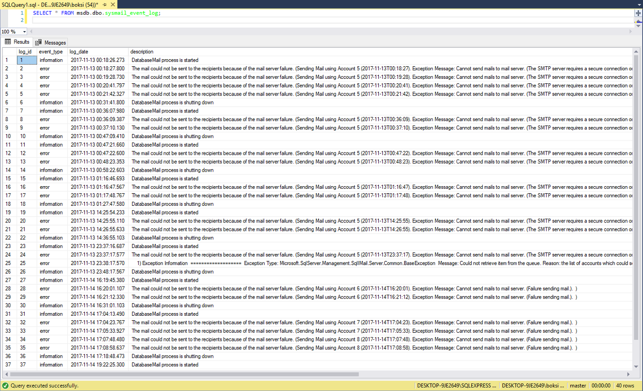 SELECT * FROM msdb.dbo.sysmail_event_log; |