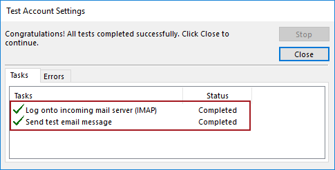 Back to Outlook, click the Next button once again to test e-mail account settings and finally a message without errors. Both tasks completed successfully: