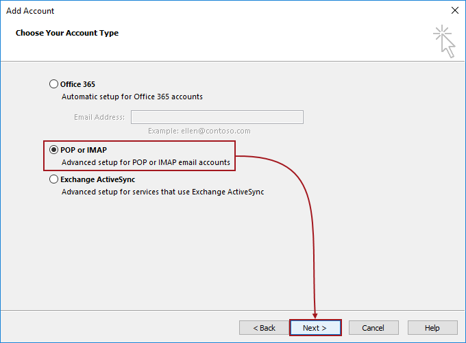 In the next step, choose the POP or IMAP option and click the Next button: