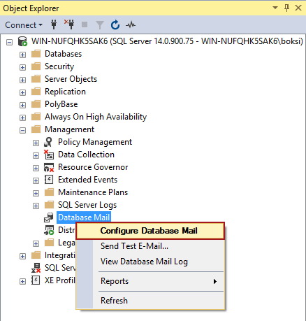 Since Microsoft SQL Server 2016 Express edition is used in this article as an example, the Management node does not have Database Mail: