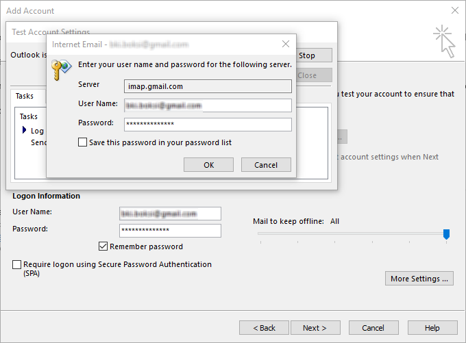 This step is crucial as this task previously failed for Database Mail. In the second dialog, Outlook will ask for the username and password. This was already configured, optionally check the Save this password in your password lint option if your Windows user account is password-protected, and no other person has access to it: