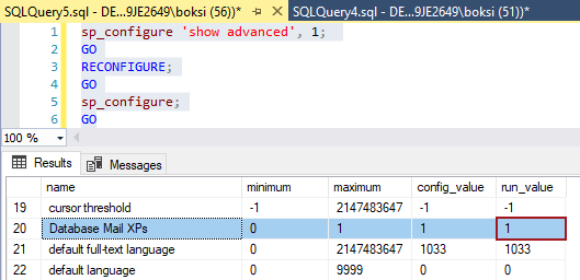 In the Results grid, make sure that the ‘run_value’ column for Database Mail XPs is set to 1: