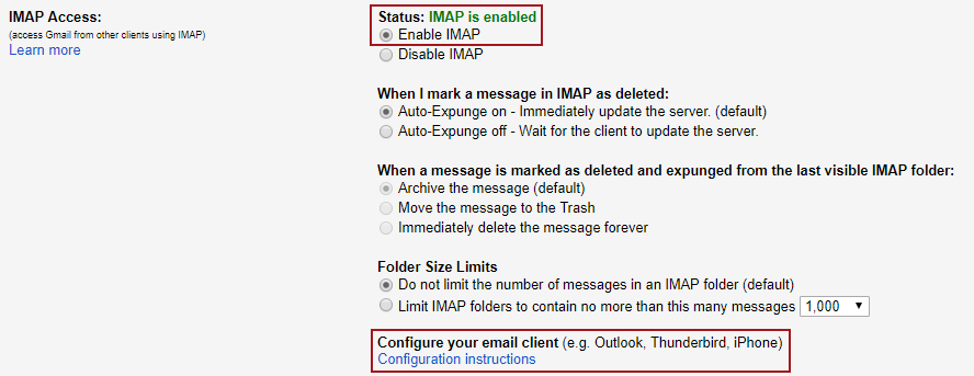 In the IMAP Access section, make sure that Enable IMAP option is selected and click the Configuration instructions link at the bottom: