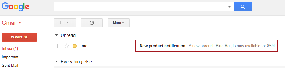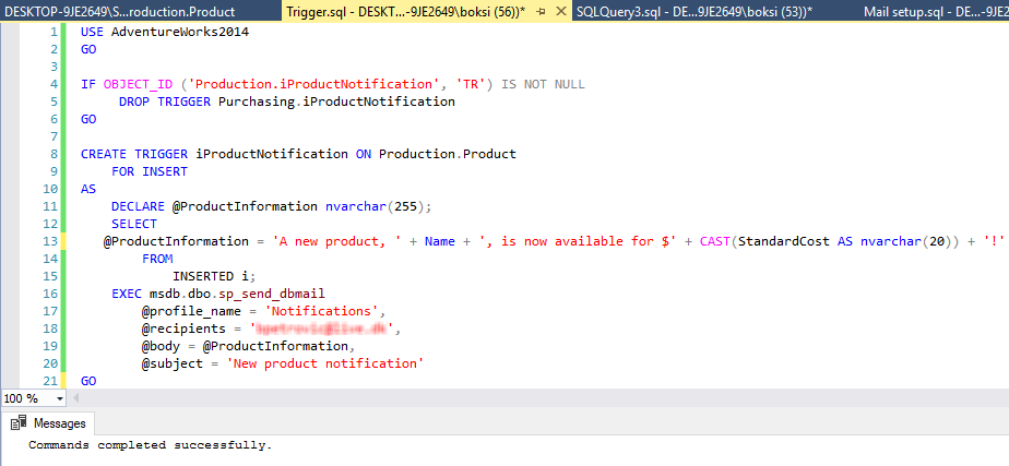 This trigger will fire when an Insert statement is run against the Product table. The idea behind it is to collect basic information about a new product that is available like name and price and to wrap that information up in a simple e-mail message that will be sent to desired addresses using the Database Mail profile previously configured: