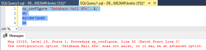 This time, the query is executed successfully. Once these two options are changed from ‘0’ to ‘1’, Database Mail is turned on: