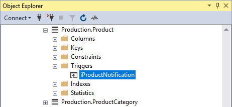 Once the trigger is created, refresh the ‘Triggers’ node under the ‘Product’ table just to make sure that the trigger is created on the right table: