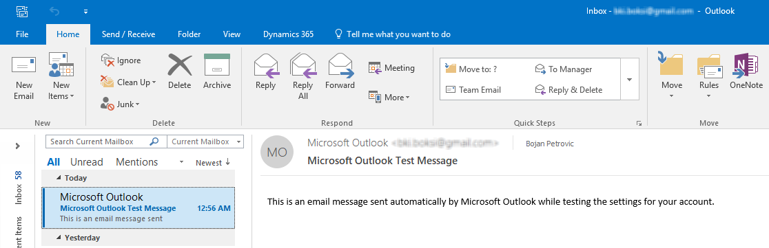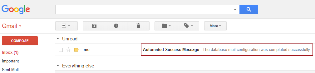 The test e-mail message is also delivered successfully which means that sending another test e-mail from Database Mail should work this time: