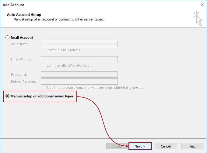 In the Add Account dialog, select the Manual setup or additional server types option and click the Next button: