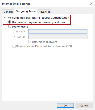 This will open the Internet e-mail settings dialog. Leave everything as it is under the General tab. Next, click the Outgoing Server tab, check the My outgoing server (SMTP) requires authentication check-box and select the Use same settings as my incoming mail server option: