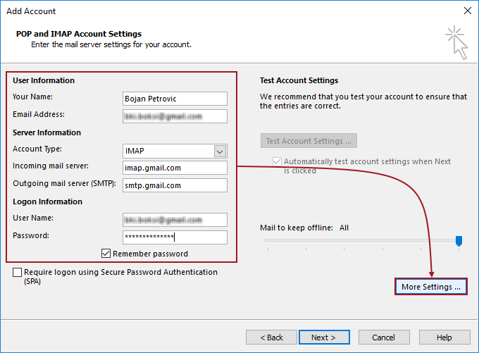 Under User Information section, make sure to enter a valid e-mail address. The e-mail address entered here will be automatically set as User Name for the Logon Information once the Account Type is selected from the drop-down box. Once finished, click the More Settings button on the right to configure additional settings before continuing further: