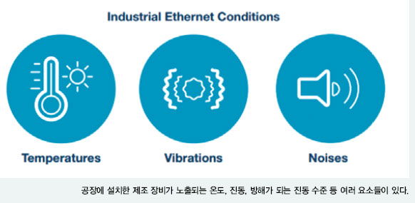 산업용 이더넷의 경우 고려해야 할 사항이 사무실에서 사용하는 일반 이더넷에 비해 많다. 공장에 설치한 제조 장비가 노출되는 온도, 진동, 방해가 되는 진동 수준 등 여러 요소들이 있다.