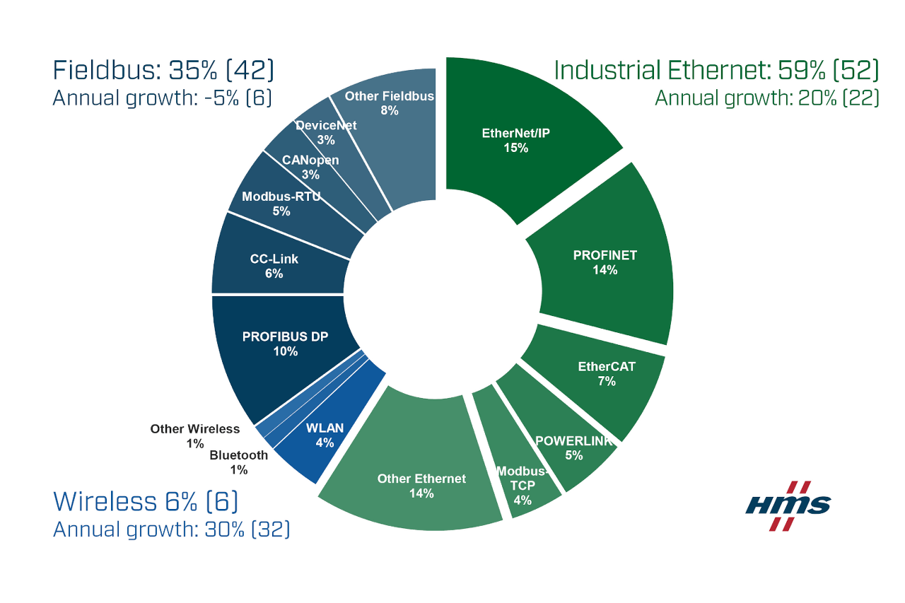 HMS 네트웍스(HMS Networks)가 발표한 산업용 네트워크 마켓에 따르면, 산업용 이더넷 시장은 현재 새로 설치된 노드의 59%(작년 52%)를 차지하고 있는 반면, 필드버스는 35%로 지난해 42%에 비해 감소세를 기록했다.