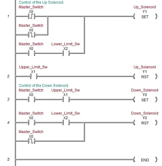 Look at the sequence table with respect to the following logic. I have used Set and Reset conditions so it is easily followed by the sequence table. When the master switch turns on the up solenoid is activated. Notice the first rung is a direct correlation. Follow the rest of the sequence table with this ladder logic.