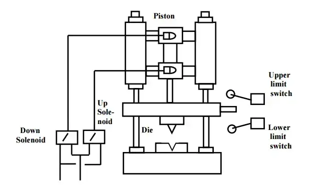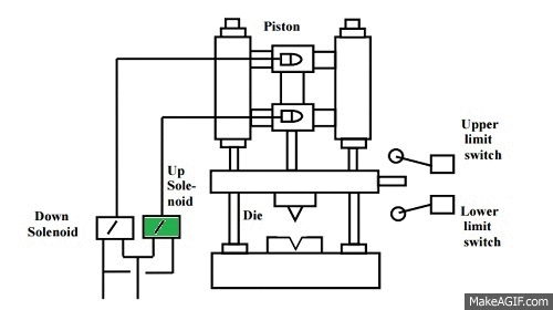 A master switch is used to start the process and to shut it down. Two sensors: an upper limit switch that indicates when the piston is fully retracted and a lower limit switch that indicates when the piston is fully extended. When the master switch is turned on the piston reciprocates between the extended and retracted positions. This is achieved with an up and down solenoid. When the master switch is turned off, the piston returns to the retracted position, and all solenoids are off.